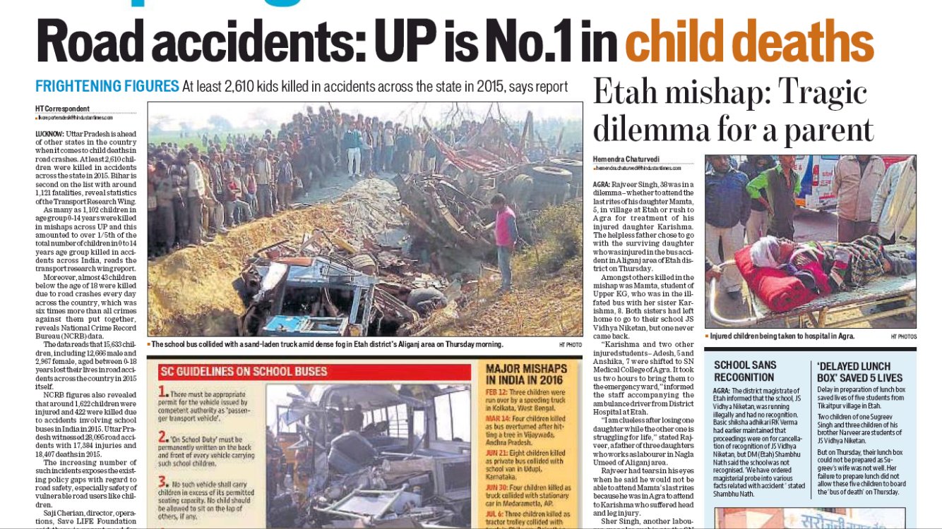 हिंदुस्तान टाइम्स (20 जनवरी 2017) में प्रकाशित समाचार के अनुसार सड़क दुर्घटनाएं और इनमें मृत लोगों विशेषकर कि बच्चों की संख्या बढ़ती जा रही है. ये एक और उदहारण हैं जब सरकारें वादें कुछ और करती हैं और जमीनी हकीकत ठीक विपरीत होती है. भारत सरकार एवं अन्य १९२ देशों की सरकारों ने वादा किया है कि 2020 तक सड़क दुर्घटनाओं में होने वाली मृत्युदर आधा हो जायेगा परन्तु मृत्यु दर तो बढ़ता जा रहा है!